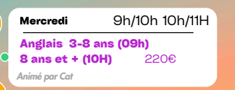 Nous proposons des cours d’anglais en mini groupes avec une animatrice enseignante spécialisée Françoise pour les enfants (petits et grands) à partir de 3 ans. Notre approche ludique (jeux, chants, activités manuelles…) est basée sur un programme pédagogique adapté. L’essentiel étant pour nous que l’enfant s’épanouisse dans la langue anglaise.